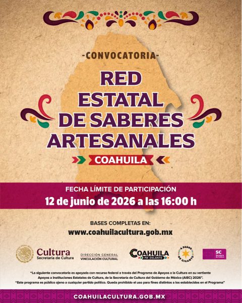 Asimismo, la convocatoria “Red Estatal de Saberes Artesanales” tiene como objetivo preservar y transmitir los conocimientos, oficios y técnicas tradicionales que forman parte del patrimonio cultural vivo de Coahuila, a través de talleres de iniciación artesanal impartidos por maestras y maestros artesanos en distintas disciplinas y expresiones propias de la identidad regional.