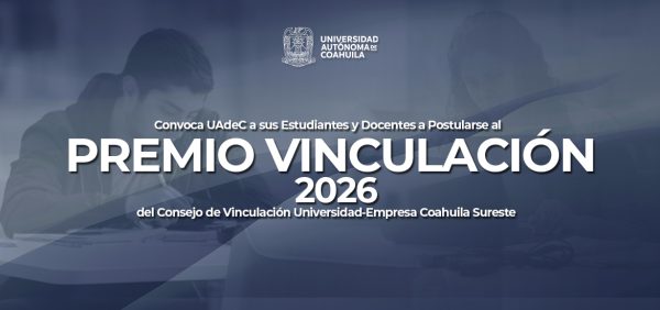 29 Abril 2026; Saltillo, Coahuila.- La Universidad Autónoma de Coahuila al pertenecer al Consejo de Vinculación Universidad-Empresa Coahuila Sureste, convoca a sus estudiantes y docentes a postularse al Premio Vinculación 2026 con fecha límite el 1 de mayo, con el que se reconoce el desempeño académico, el compromiso social, las actividades de vinculación, la calidad humana de estudiantes y docentes de las Instituciones de Educación Superior pertenecientes al Consejo.
