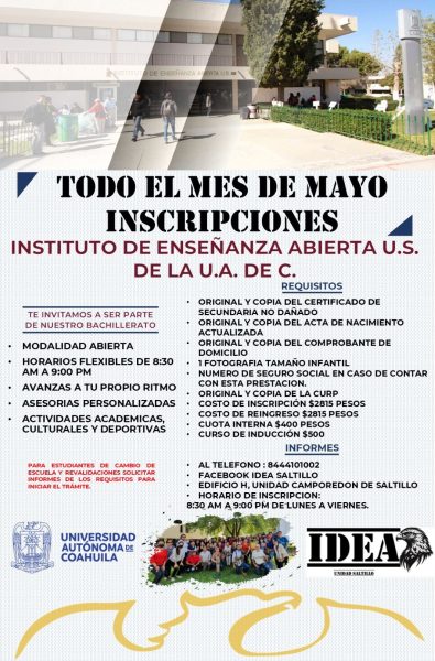 Para más información visitar la página de Facebook IDEA Saltillo, llamar al (844) 41 01 002 o acudir al plantel ubicado en el Edificio “H” de la Unidad Camporredondo en Saltillo, en un horario de lunes a viernes de 8:30 a 21:00 horas.