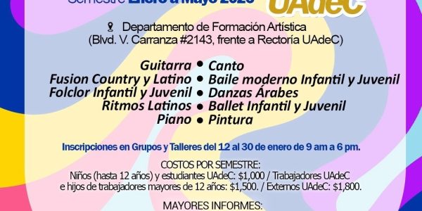 Invita UAdeC a Inscribirse a sus Talleres de Formación Artística Por Jorge Moreno 12 Enero 2026; Saltillo, Coahuila.- La Universidad Autónoma de Coahuila, a través de la Coordinación General de Difusión y Patrimonio Cultural y el Departamento de Formación…