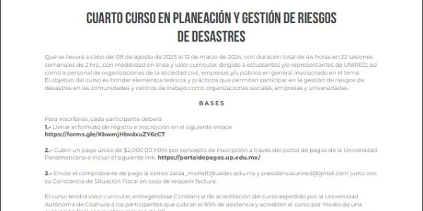 Convocan UAdeC y UNIRED al Cuarto Curso en Planeación y Organización en Gestión de Riesgos de Desastres